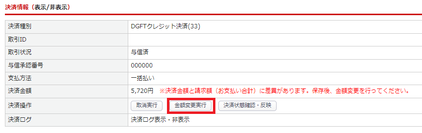 決済操作【金額変更実行】ボタンをクリックしてください。