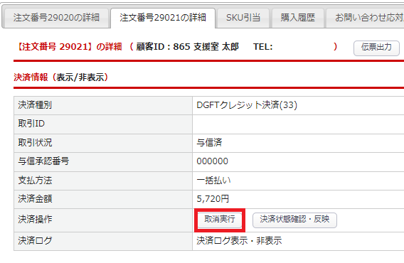 該当受注の受注登録画面を開き、決済操作から【取消実行】ボタンをクリックします。