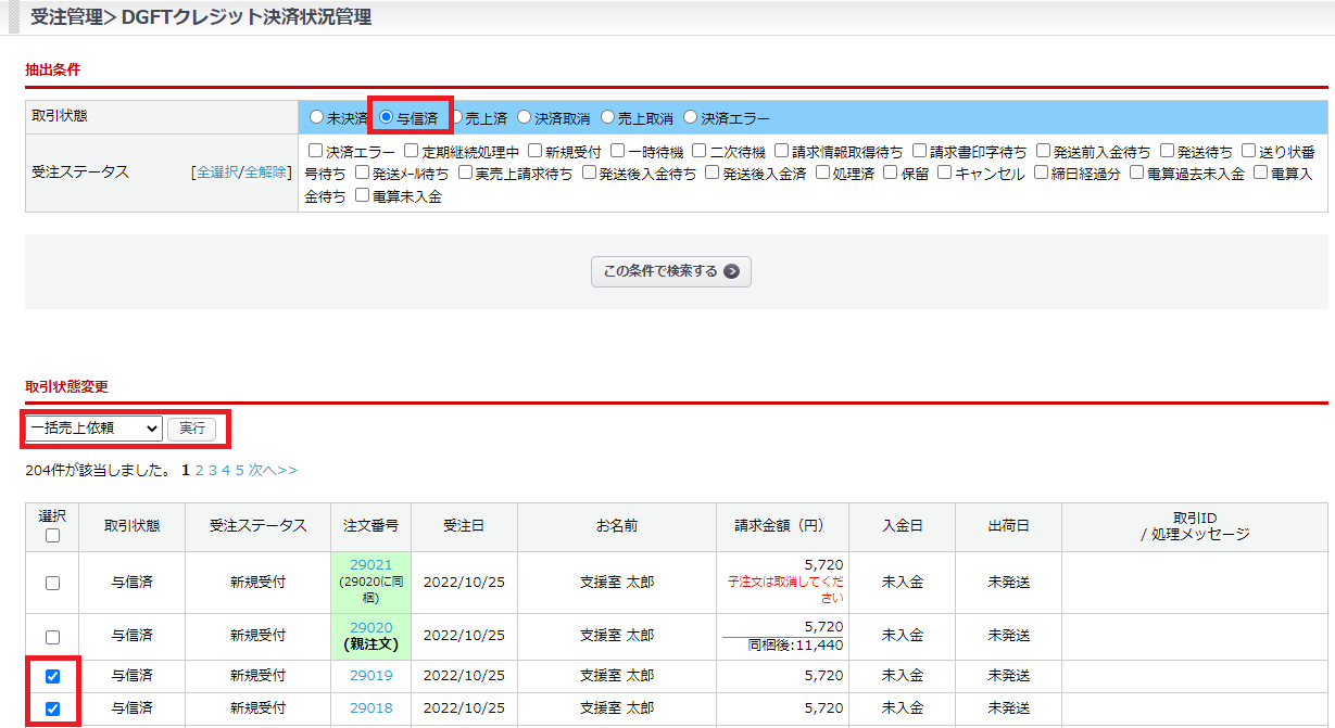 3.プルダウンから「一括売上依頼」を選択して【実行】ボタンをクリックしてください。