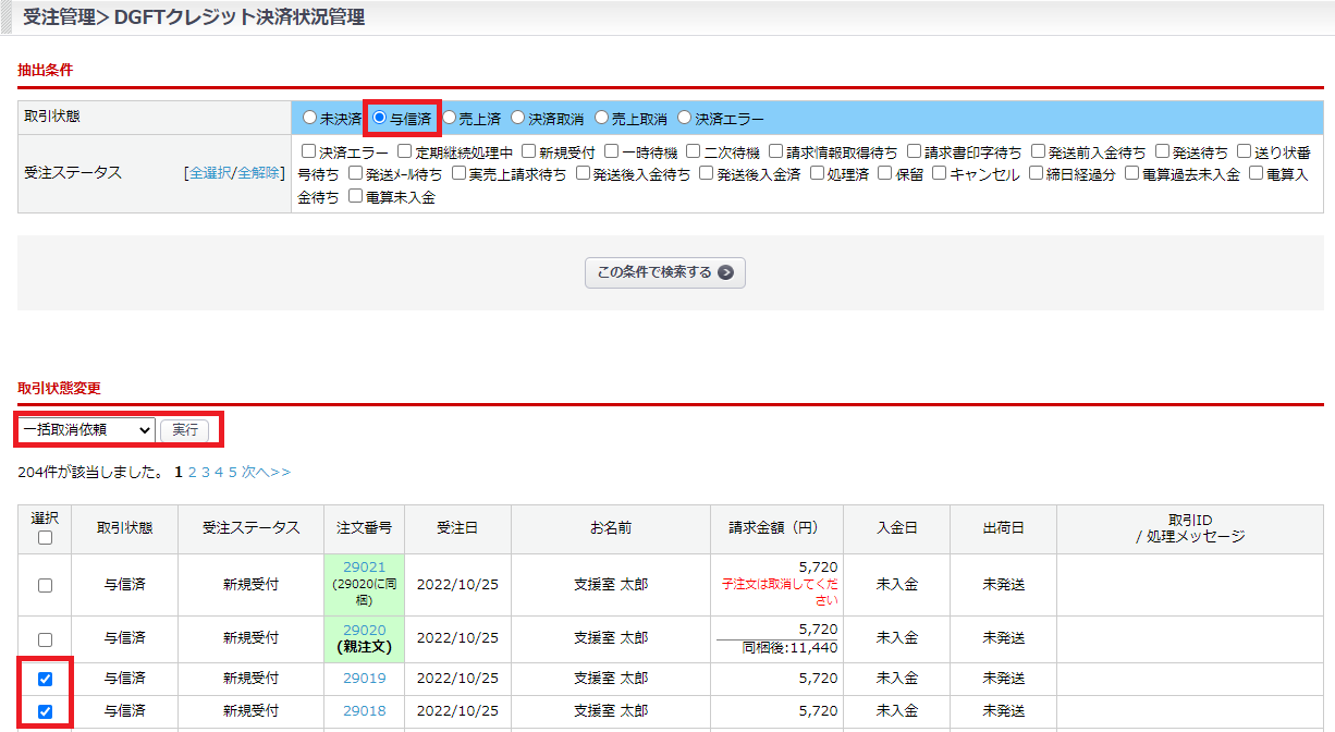 ※取引状態「与信取消済」で抽出しなおすと該当受注が表示されることをご確認ください。
