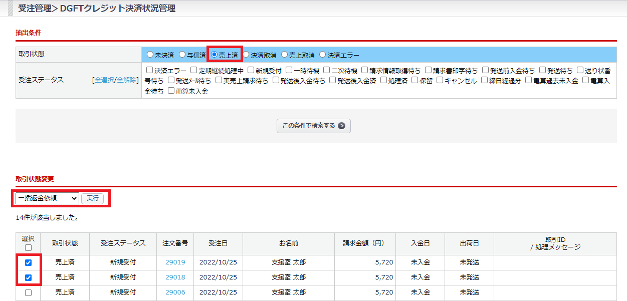 ※取引状態「返金済」で抽出しなおすと該当受注が表示されることをご確認ください。