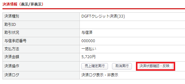 DGFT側の決済状況がスマレジEC・リピートに反映されていない場合は受注登録画面の【取引状態確認・反映】ボタンをお試しください。