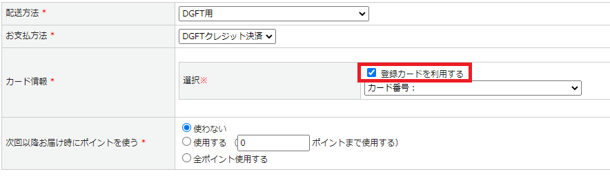 <受注>定期購入お申込み一覧>より該当定期データの登録画面を開き、カード情報「登録カードを利用する」のチェックを外します。