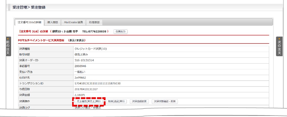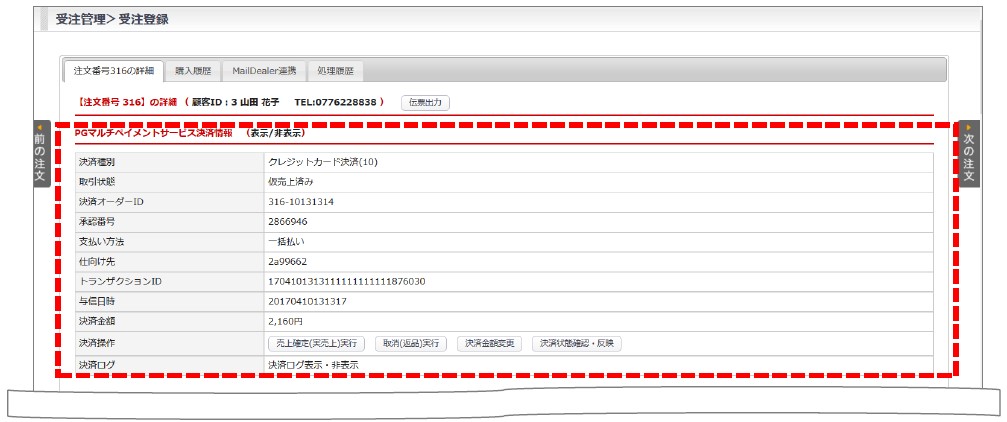 •受注登録画面上部に「PGマルチペイメントサービス決済情報」が表示されます。
