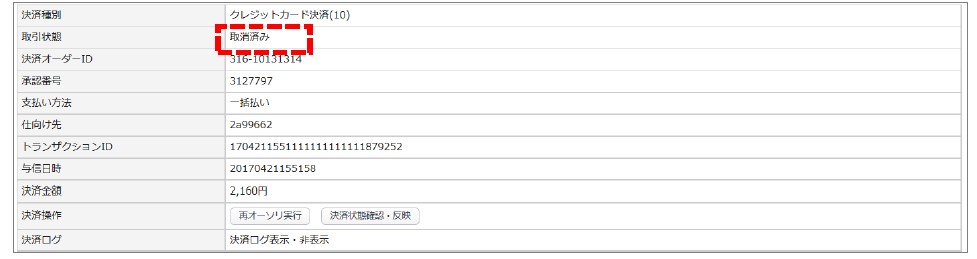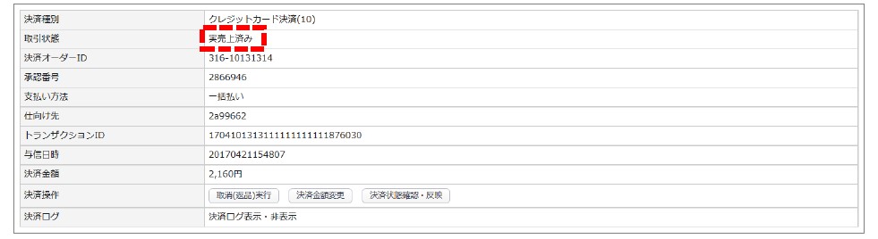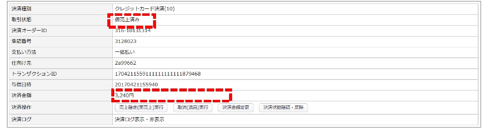 •決済金額:与信枠取得済みの金額です(取引状態が仮売上済みの場合)