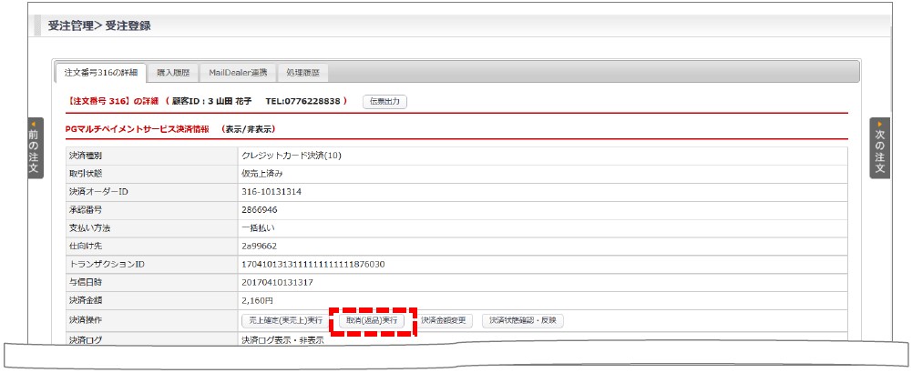 ・受注登録画面からオーソリ取消(返品)を行う場合