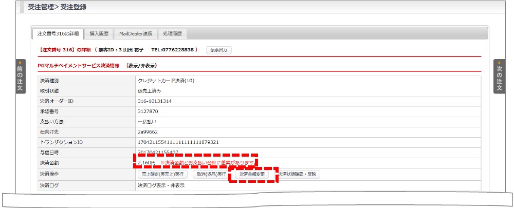 決済操作より「決済金額変更」ボタンを押下→完了すると決済金額に変更後の金額が反映され、注意表記が消えます