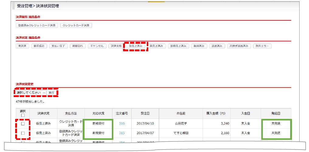 - 決済状況抽出条件より「仮売上済み」ボタンを押す→仮売り済みの受注のみ抽出します。