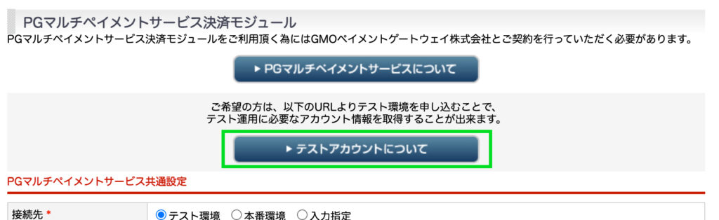 [GMOペイメントゲートウェイ]の「設定」から、PGマルチペイメントサービスのページへ遷移し、