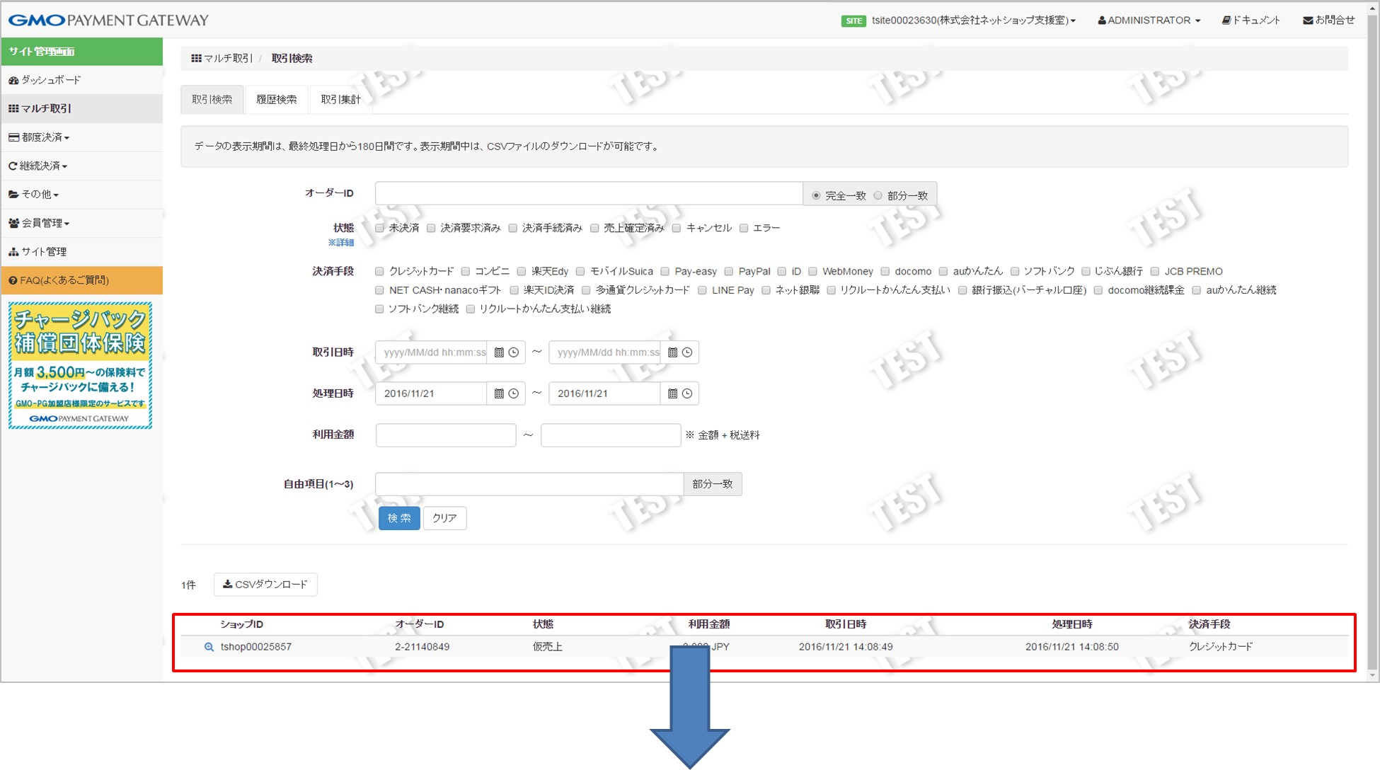 サイト管理画面にログインし、マルチ取引画面の取引検索画面で【検索】をクリックし、結果にスマレジEC・リピートのお支払い金額が表示されることを確認します。