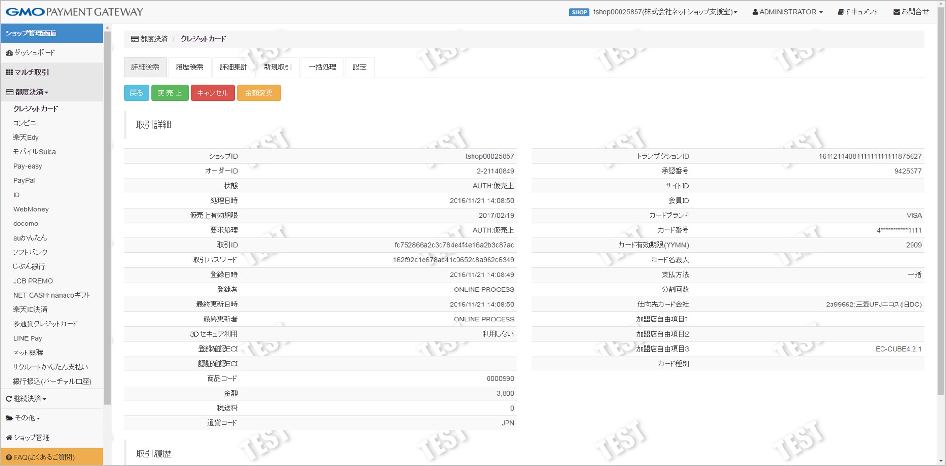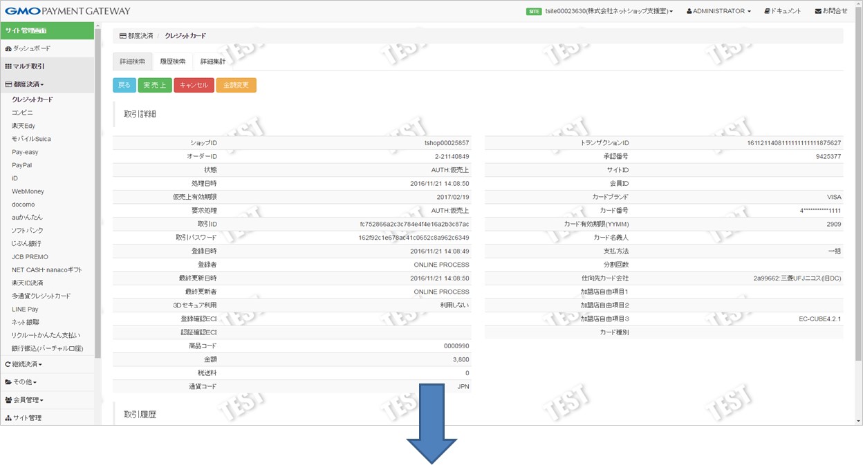 完了画面にクレジットカード決済情報が表示されていることを確認します。