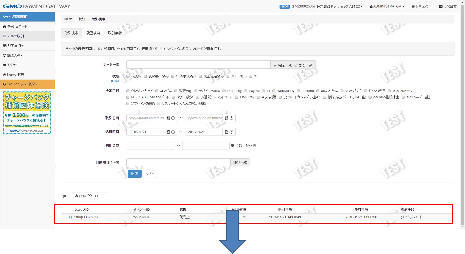 ショップ管理画面にログインし、マルチ取引画面の取引検索画面で【検索】をクリックし、結果にスマレジEC・リピートのお支払い金額が表示されることを確認します。