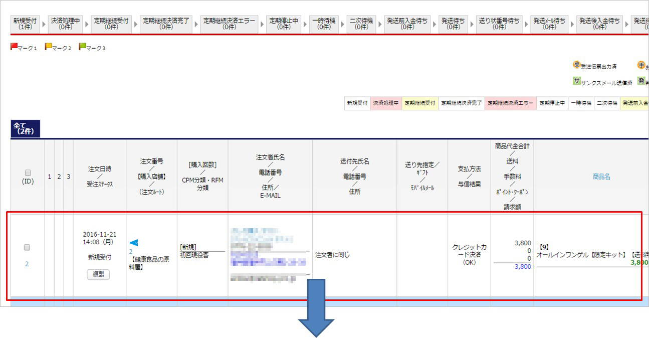 受注管理>受注一覧にて、検索結果にクレジットカード決済の受注が表示されることを確認します。