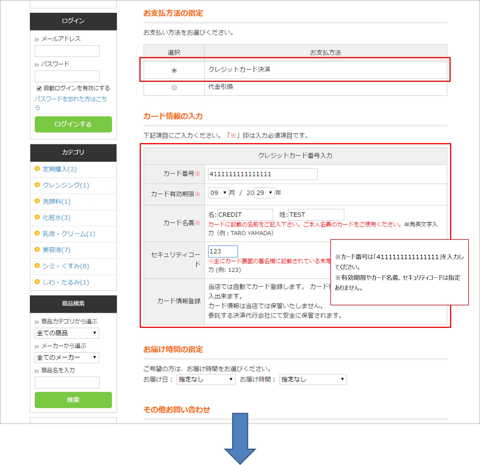 任意の商品をカゴにいれ、お支払方法入力画面にて支払方法にクレジットカード決済を選択します。