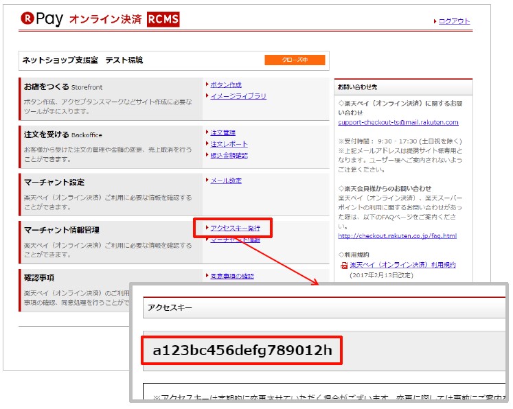 RCMS管理画面トップの「アクセスキー発行」をクリックし、アクセスキーをコピーします。