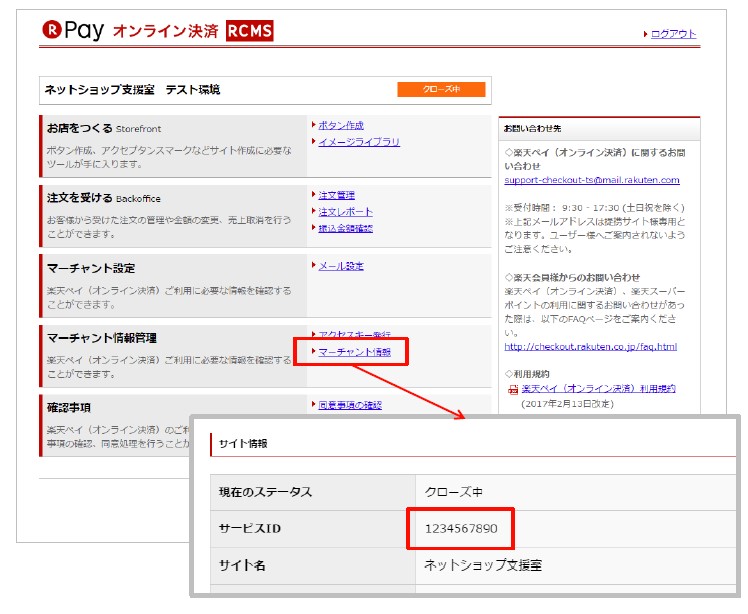 RCMS管理画面トップの「マーチャント情報」をクリックし、サービスIDをコピーします。