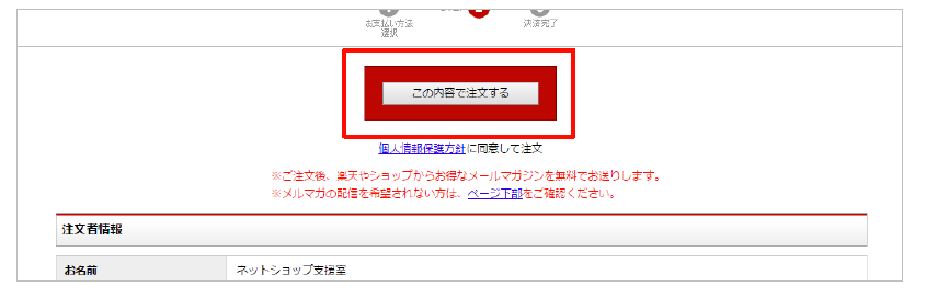 楽天の画面にてクレジットカードを選択し、決済を完了させます。その後、ショップの購入完了画面へ戻ります。