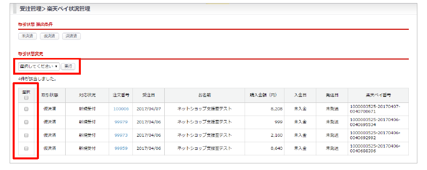 受注>楽天ペイ状況管理 より一括処理が可能です。