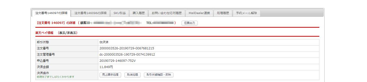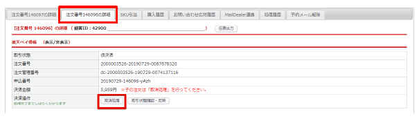 スマレジEC・リピートの受注管理画面にて、楽天ペイの決済処理が可能です。