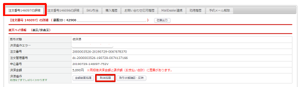取消処理完了後、親注文の決済操作に表示される「同梱後オーソリ」より、同梱後の金額でオーソリを実施します