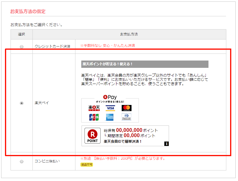 ■お支払方法・お届け時間等の指定画面、支払方法に「楽天ペイ」が表示されます。