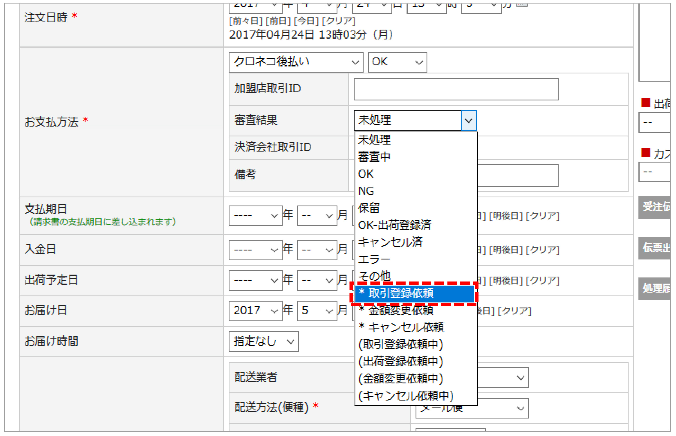 審査結果より「*取引登録依頼」を選択し【この内容で登録する】ボタンをクリックして受注データを保存します。