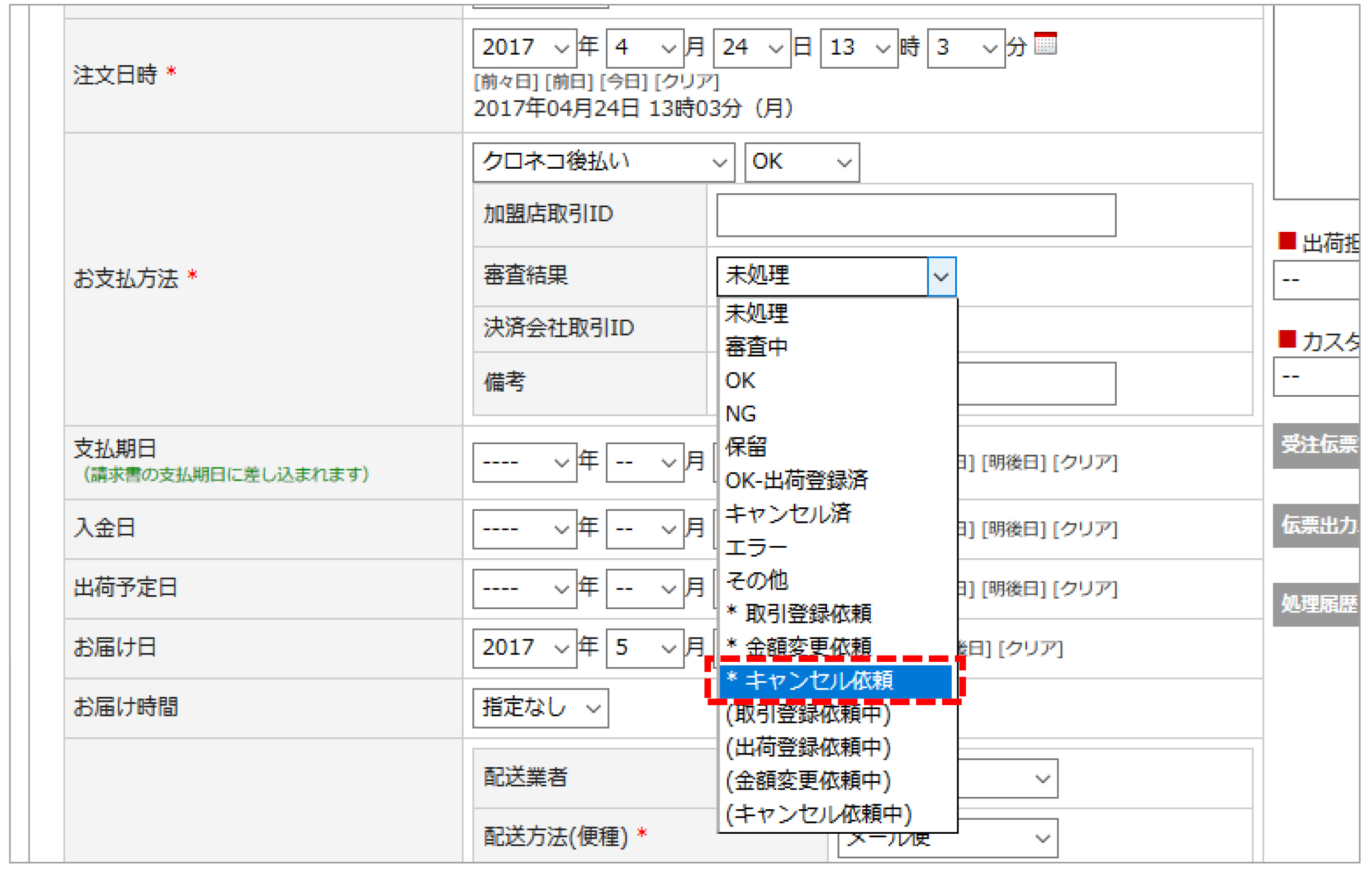 お支払方法横の取引登録状態が「未処理」のまま「*キャンセル依頼」をかけると、エラーとなる場合がございます。
