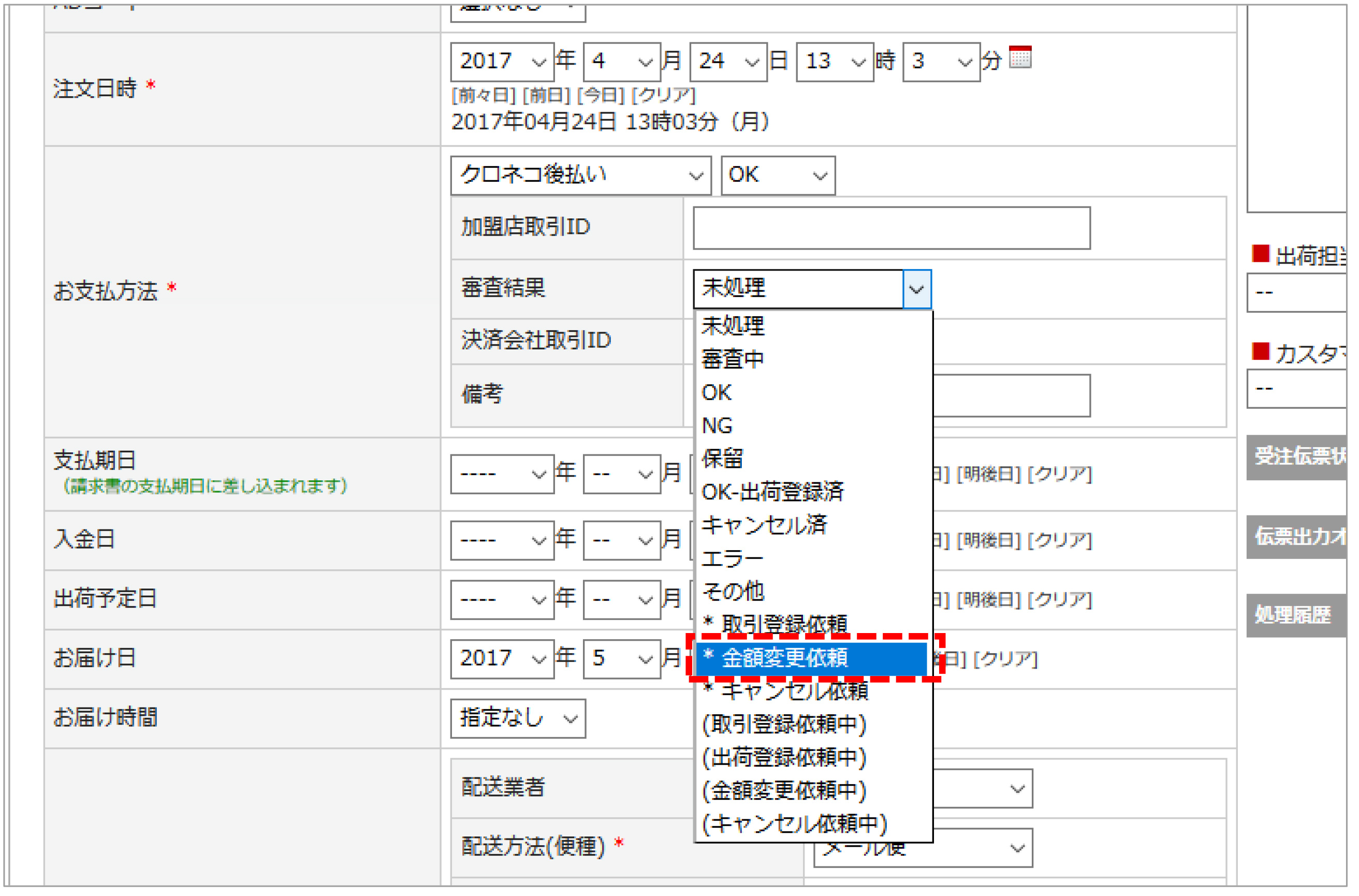 その場合は、取引登録状態を「未処理」にし、審査結果も「キャンセル済」としてください。念のため、後払い決済会社様の管理画面でも確認いただくことを推奨いたします。