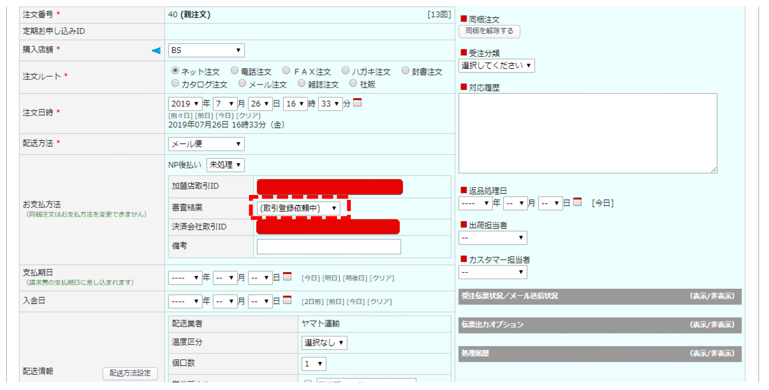 自動化の設定をしてない場合は、お支払い方法の審査結果より「*取引登録依頼」を選択 → 登録をすると、与信が行われます。