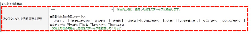 ショップ基本設定>管理システム設定>業務フロー設定タブ>■8. 売上請求業務の「ゼウスクレジット決済実売上処理」より設定いただけます。