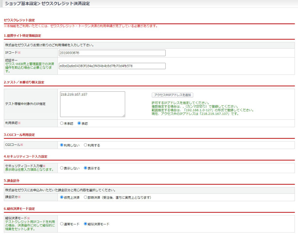 →利用承認が「未承認」状態の場合、指定したIPアドレス以外のアクセスの場合はゼウスカードを利用できなくする設定です。 - 疑似決済モード設定