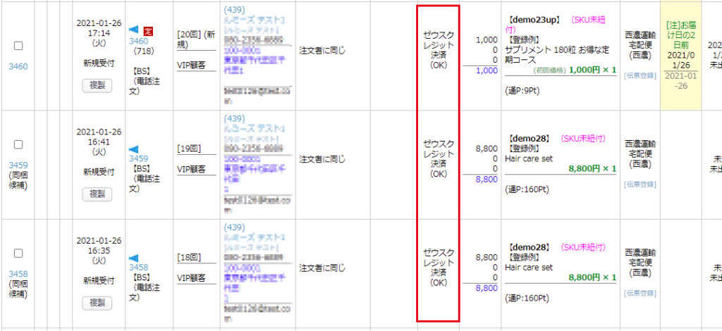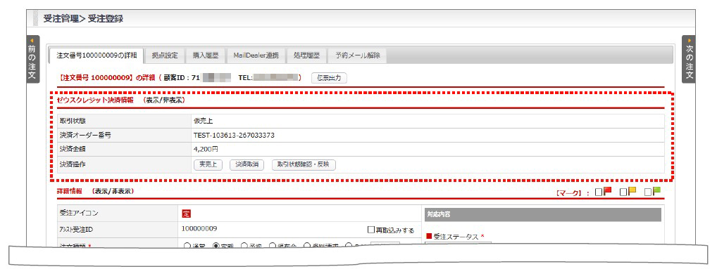 - 受注登録画面上部に「ゼウスクレジット決済情報」が表示されます。