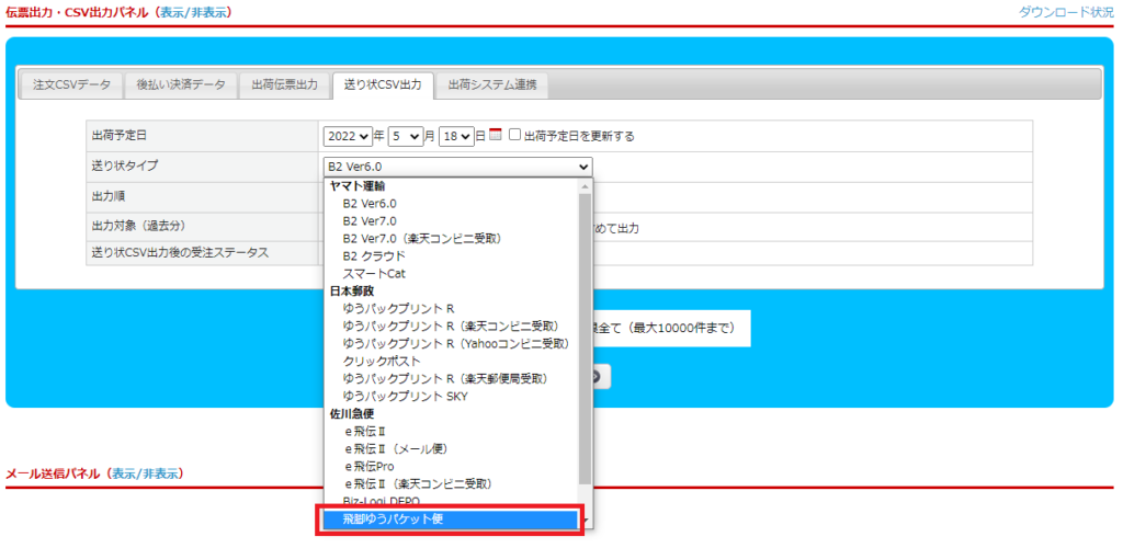 受注>受注一覧 伝票出力・CSV出力パネル>[送り状CSV出力]タブ