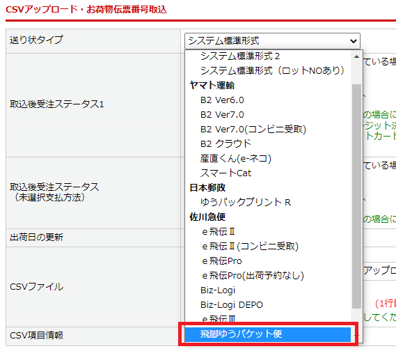 「送り状タイプ」について[(佐川急便)飛脚ゆうパケット便]を選択します。