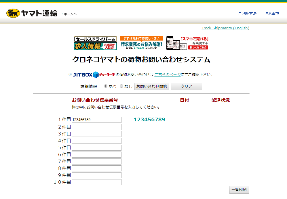 - クリックすると、配送会社のお問い合わせ画面へ移動します。