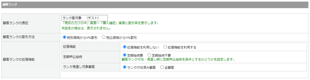 | 顧客ランクの表記 | 顧客ランクが適用される場合、購入フローに表示する表記の設定が可能です。 「現在のカゴの中」画面~「購入確認」画面に割引率を表示します。 未設定の場合は表示されません。 |