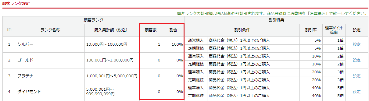 4つのランクを登録し、購入金額累計が上がるごとに割引率・ポイント倍率が上がるように設定