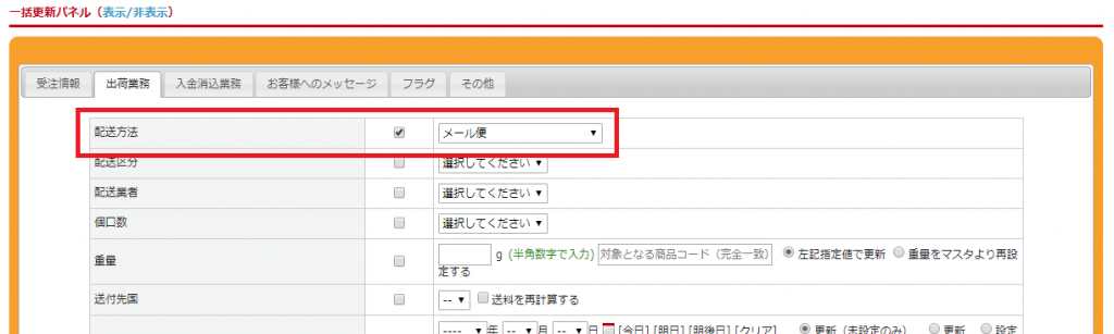まだ発送されていない受注に絞り込み、一括更新パネルにて配送方法を変更してください。