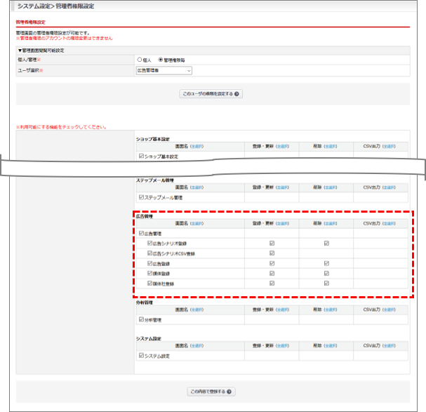 ※「広告管理」のみチェックを入力すれば広告の管理、分析確認が可能です。