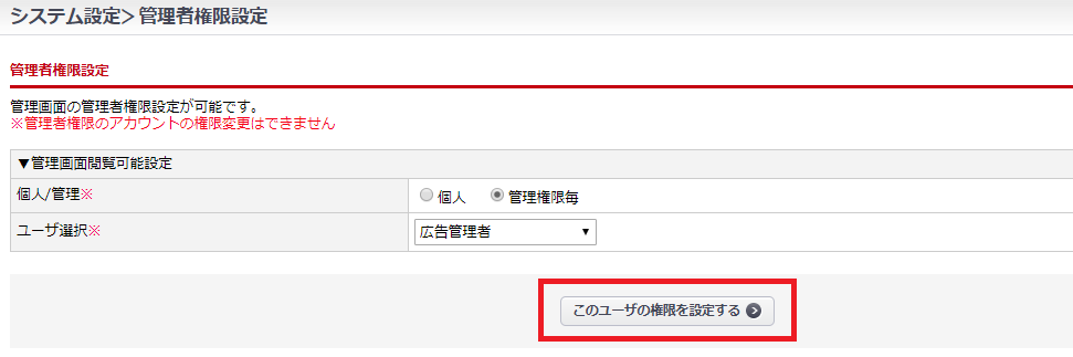 広告管理対象運営者 広告分析機能の表示対象権限を設定します。