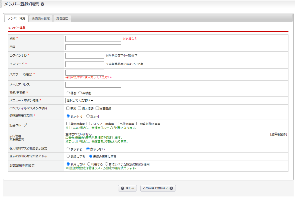 管理画面にログイン可能なメンバーの新規登録、登録済みのメンバー情報の編集を行います。