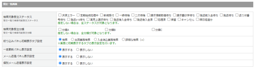 一括更新パネル表示設定 受注一覧画面の一括更新パネルの表示を設定します。