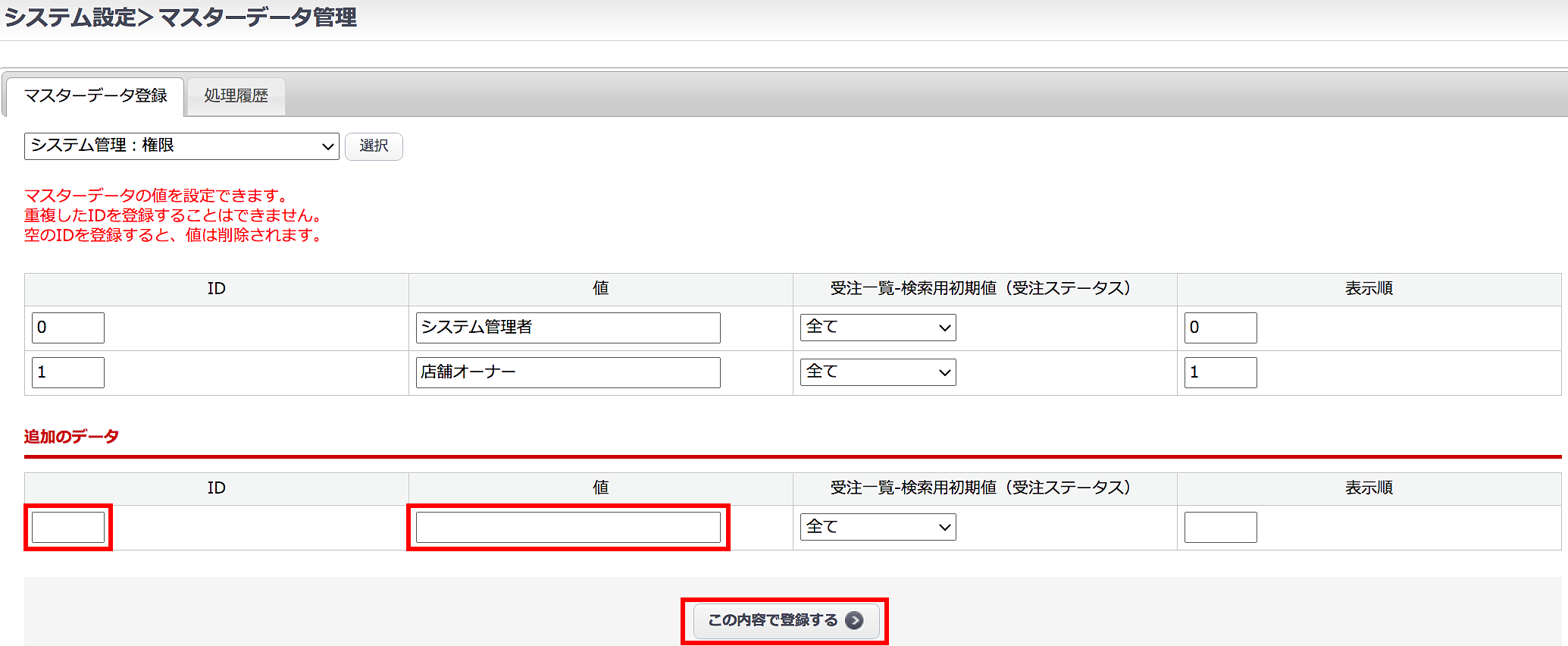 「追加のデータ」からIDと値を登録し、【この内容で登録する】ボタンをクリックしてください。
