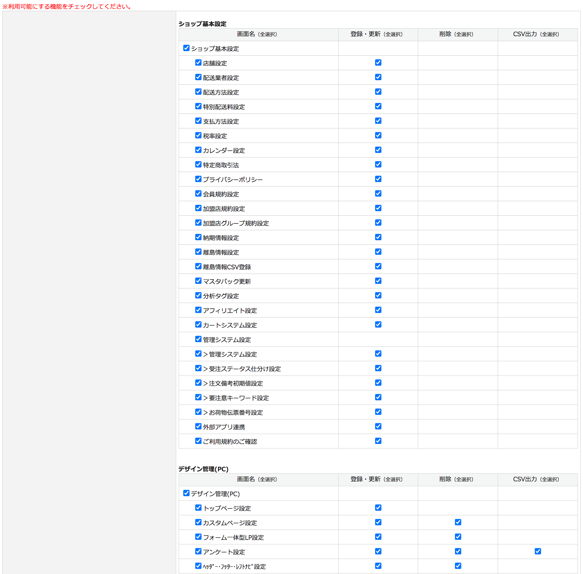 機能一覧が表示されるので、権限を付与したい機能のみチェックをいれて、登録してください。