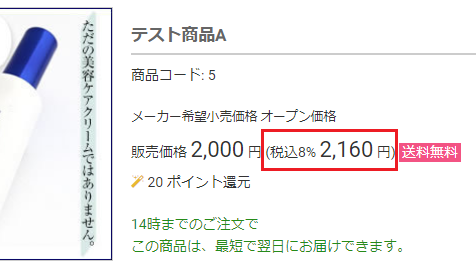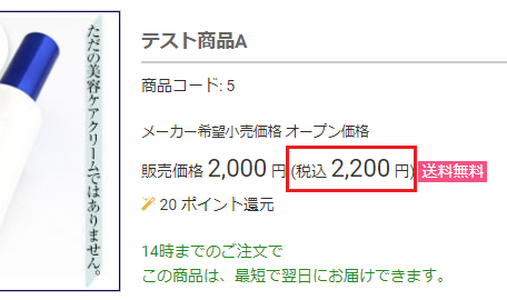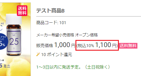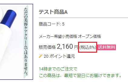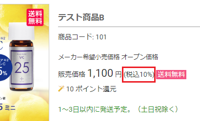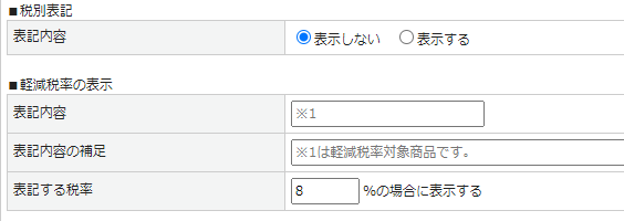 | 消費税率表記 | 商品詳細ページにて、消費税率を表示するかしないか設定します。 |