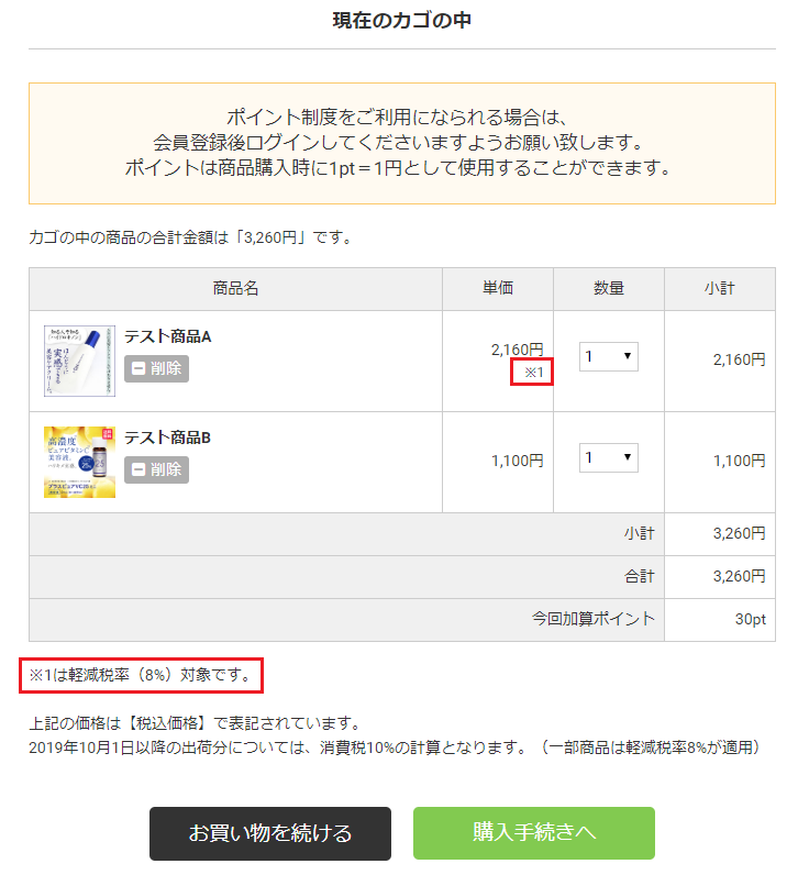 複数税率の商品がカゴに入っている場合、まとめ割引は有効になりません。