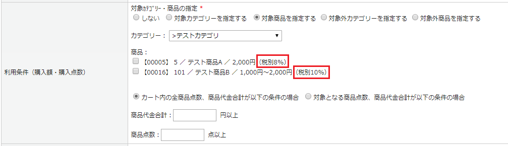 リピート割引、クーポン管理などの設定画面にて商品の消費税率が表示されるようになります。