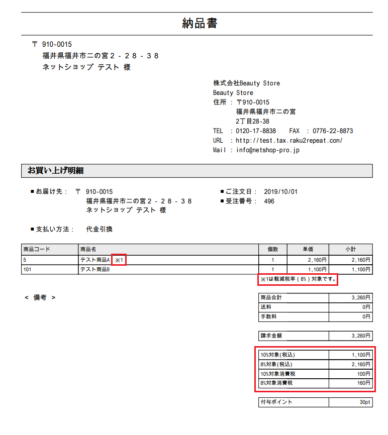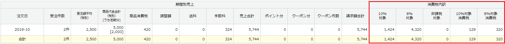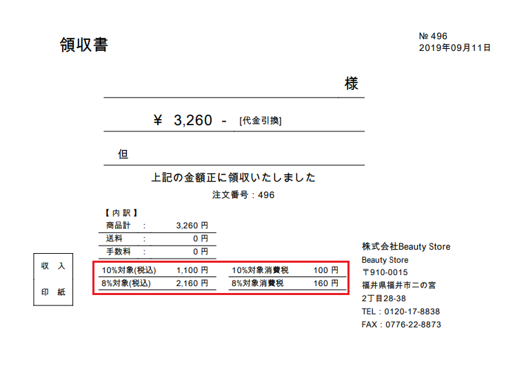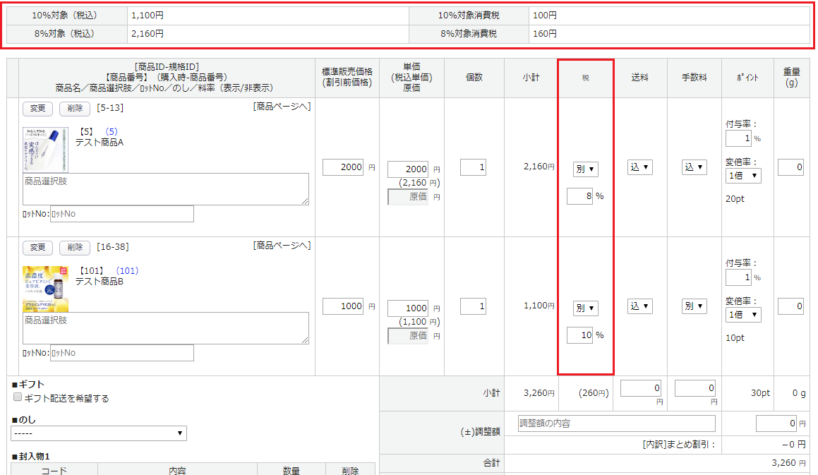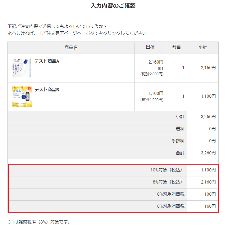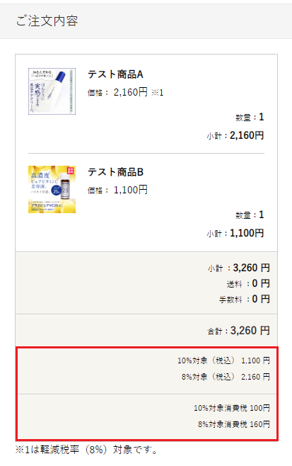 | 8%(軽減税率の対象商品)のみ | ・軽減税率設定:全商品一律 ・消費税率:8 ・送料消費税率:10 ・手数料料消費税率:10 |