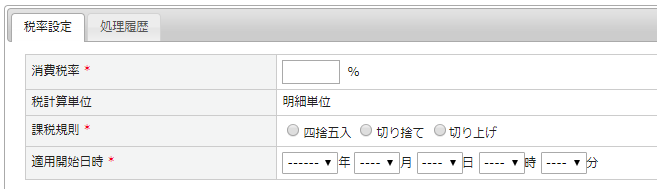 | 適用開始日時 | 登録する税率設定の適用開始日時を指定してください。 適用開始日時は注文日時を基準に切り替えが行われます。 定期継続時のご注文は、次回お届け日を基準に切り替えとなります。 ※受注データ作成時に再取得し計算、また定期データに再設定されます。 |