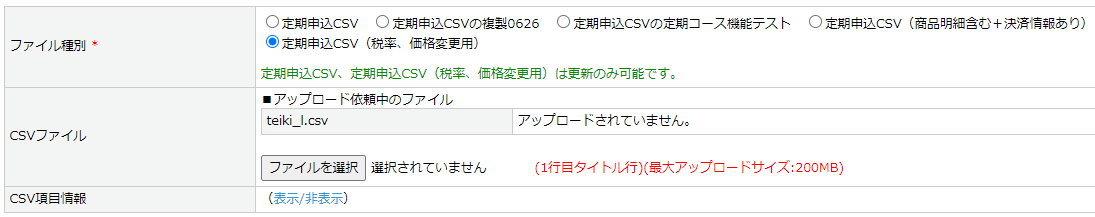 アップロード:受注>定期購入お申し込みCSV登録